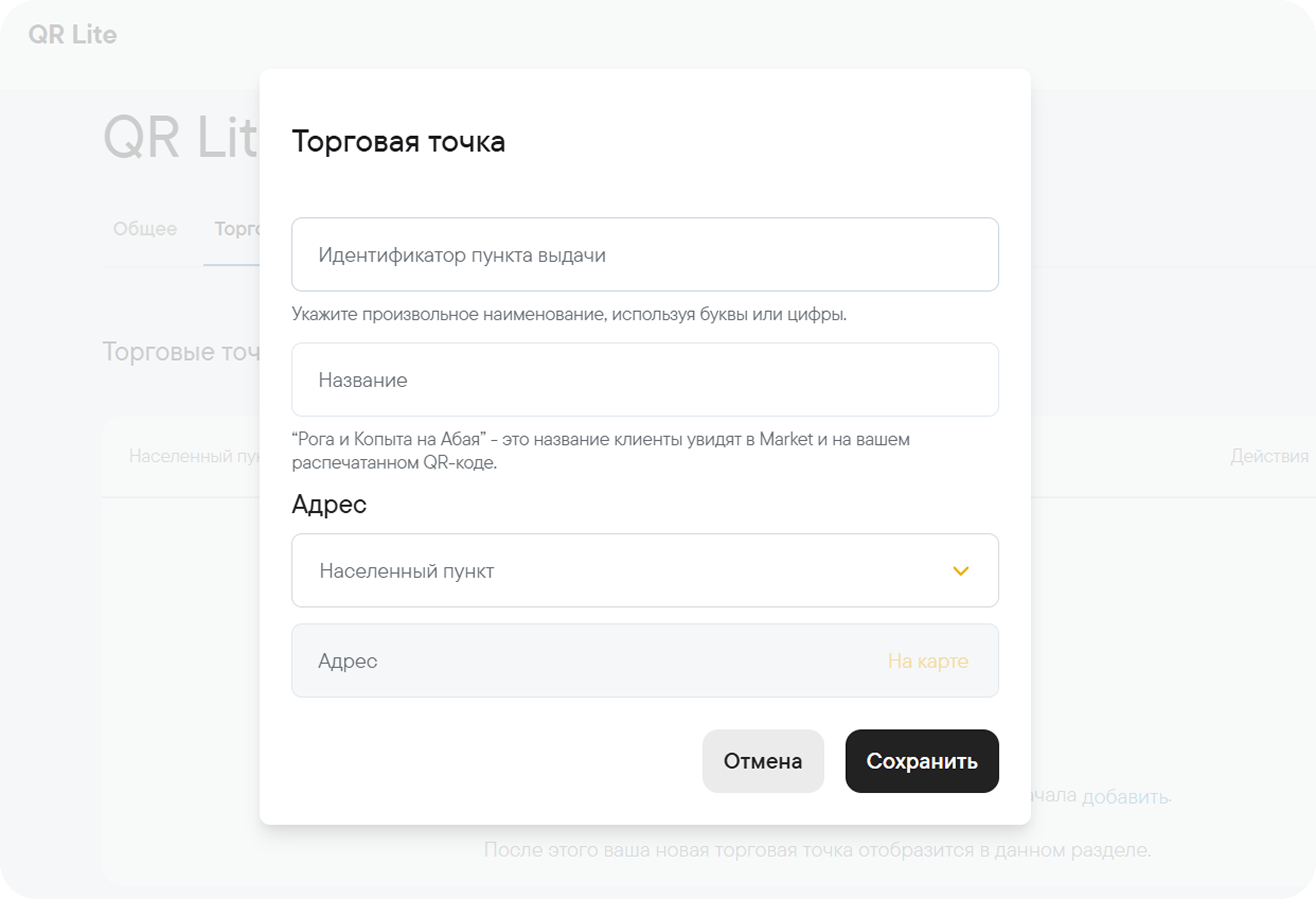 Чтобы добавить новые адреса ваших торговых точек или пунктов вывоза товара, перейдите во вкладку «QR Lite» в Личном кабинете продавца, далее в раздел «Торговые точки» и нажмите "+Добавить".